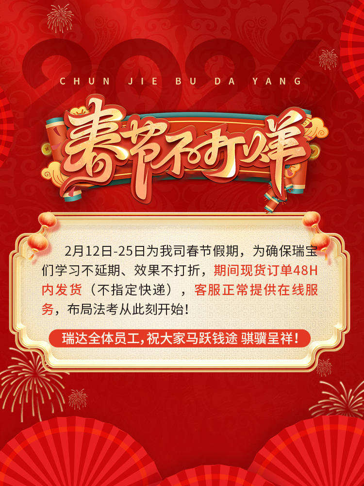 2月12日-25日为我司春节假期,为确保瑞宝们学习不延期、效果不打折,期间现货订单48H内发货(不指定快递),客服正常提供在线服务,布局法考从此刻开始!